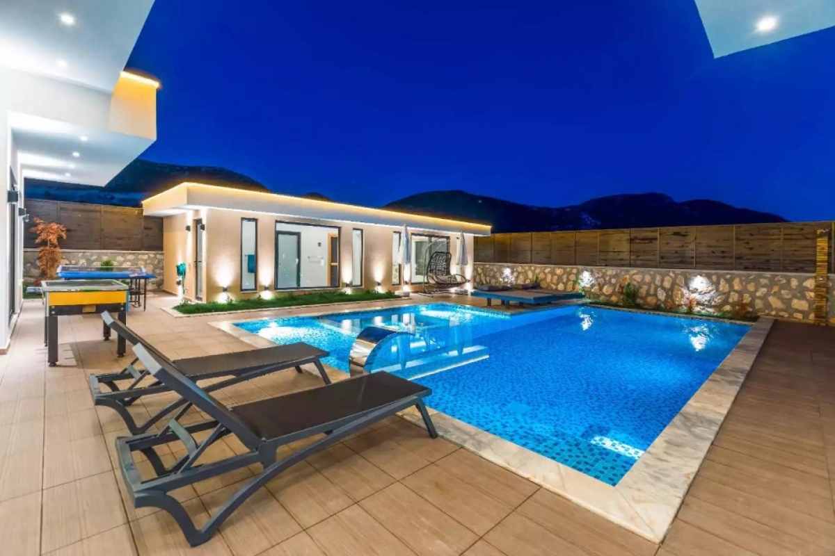 Kalkan Bezirgan bölgesinde yemyeşil doğa içerisinde lüks detaylara sahip kiralık tatil villasıdır. Kiralık Villa Havanas, jakuzili villalar, sanalı villalar, hamamlı villalar, muhafazakar villalar ve balayı villaları kategorisinde yer alan 2 yatak odalı 5 kişi konaklama olanağına sahiptir. Villamız oldukça modern ve şık dizayn edilmiş ve özenle tasarlanmıştır. İnşası bu yıl tamamlanmış ve siz değerli misafirlerimizin beğenisine sunulmuştur. Villamız mutfak kısmında misafirlerimizin tüm ihtiyaçlarını karşılayacak şekilde bütün mutfak araç gereçleri bulunmaktadır. Villamız geniş bahçe ve havuz terasına sahip olup; havuzu korunaklıdır. Muhafazakar ve çocuklu ailelere, balayı çiftlerine son derece ideal bir seçenektir.